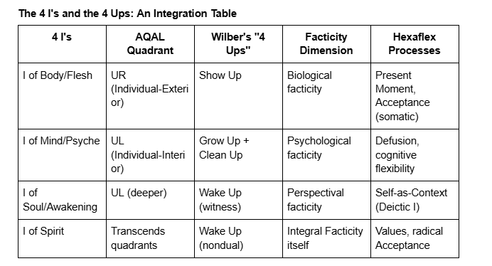 This nesting also reveals how ACT’s hexaflex implicitly addresses facticity. Acceptance, in ACT, means making room for difficult experiences rather than struggling against them—this is precisely the cessation of struggle against facticity that Integral Facticity foregrounds. Defusion means observing thoughts as mental events rather than literal truths—this is engaging with psychological facticity (the mind’s productions) without being consumed by it. Contact with present moment means flexible attention to here-and-now—this is engaging perspectival facticity (the situated I/Here/Now). Self-as-Context means accessing the observing self—this is the I of Soul’s witness function. Values means clarity on what matters—this connects to the I of Spirit’s ultimate orientation. Committed Action means effective behavior guided by values—this is Showing Up within facticity.